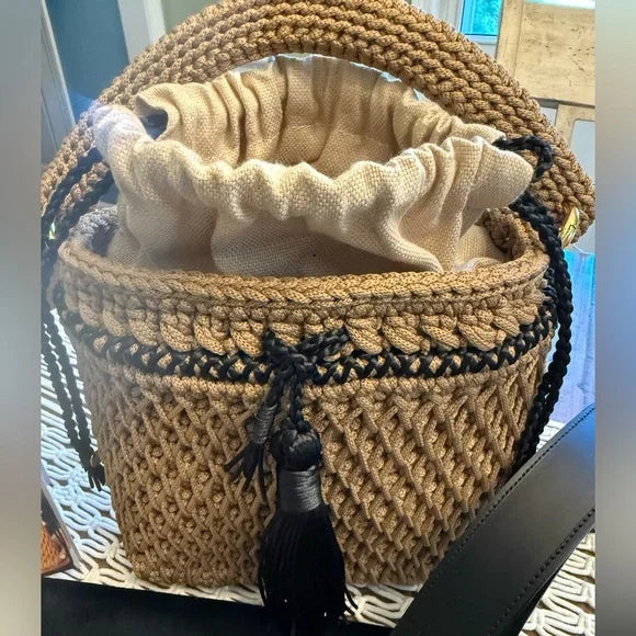 It comes with two straps: a hand strap in crochet and a cowhide leather shoulder strap. Spacious enough to hold all you want, it teatures a braided drawstring to close the bag and keep belongings secure. At the bottom, there are 4 gold protective metal studs and a special embroidered finish. A removable leather strap offers multiple carry options. 9.5 x 5.1 x 8.7 in 24 × 13 x 22 cm (Length x Height x Width) Weight: 2.6 lb / 1,200 grams