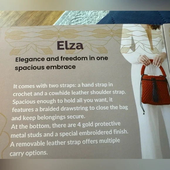 It comes with two straps: a hand strap in crochet and a cowhide leather shoulder strap.