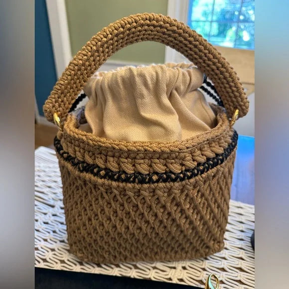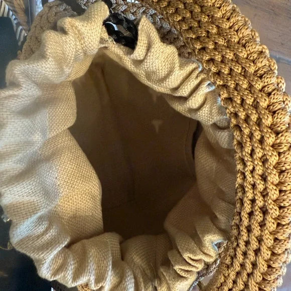 It comes with two straps: a hand strap in crochet and a cowhide leather shoulder strap. Spacious enough to hold all you want, it teatures a braided drawstring to close the bag and keep belongings secure.