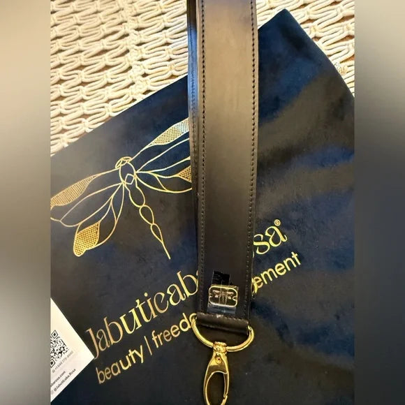 At the bottom, there are 4 gold protective metal studs and a special embroidered finish. A removable leather strap offers multiple carry options.