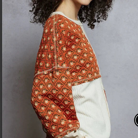 Designed in round neck long sleeve regular fit top in thermal with contrast fabric patchwork detailing.