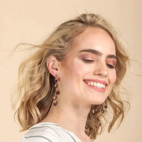 Embrace natural beauty with these striking Branch Earrings. This piece features a gorgeous display of natural gemstones held carefully on a brass bough. Each stone contains a unique crystalline design that draws in the eyes. Both edgy and elegant, this piece will become one of your favorites.